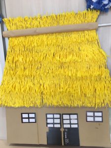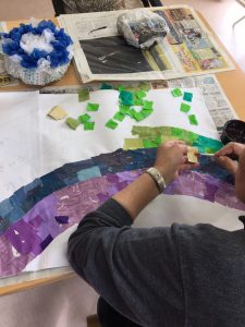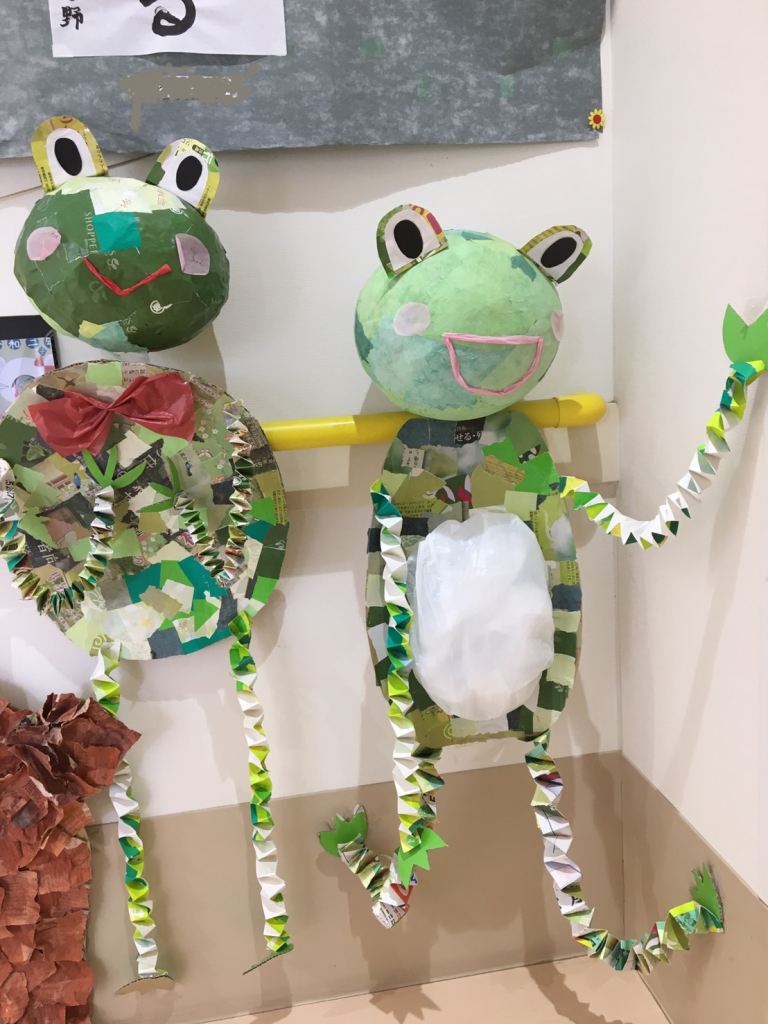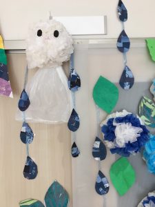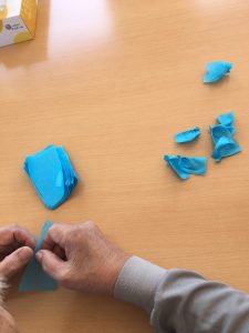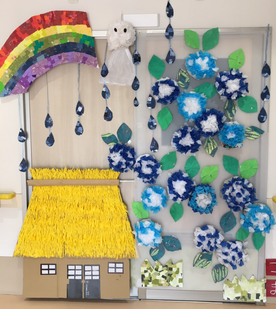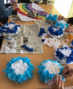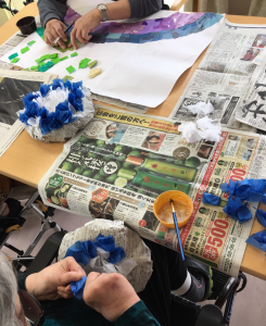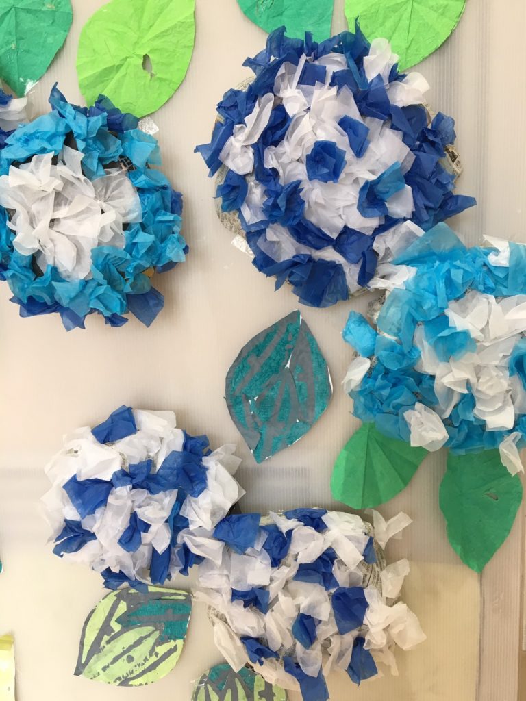 今月はアジサイが咲いています。お花紙をねじって、新聞で作った土台に貼り付けて『アジサイの花』を作りました。